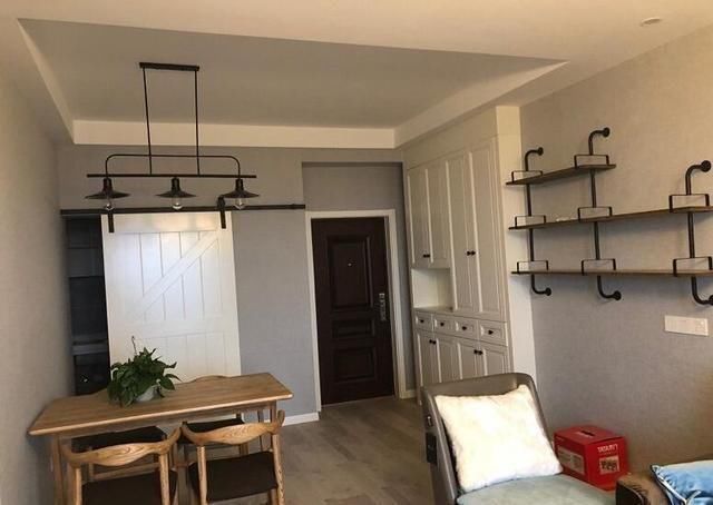 玄关进门来着这样的,右边是一个内嵌式设计的玄关橱柜,再进来点的墙上还做了一个简易的悬挂式的书柜,左边过来是餐厅。